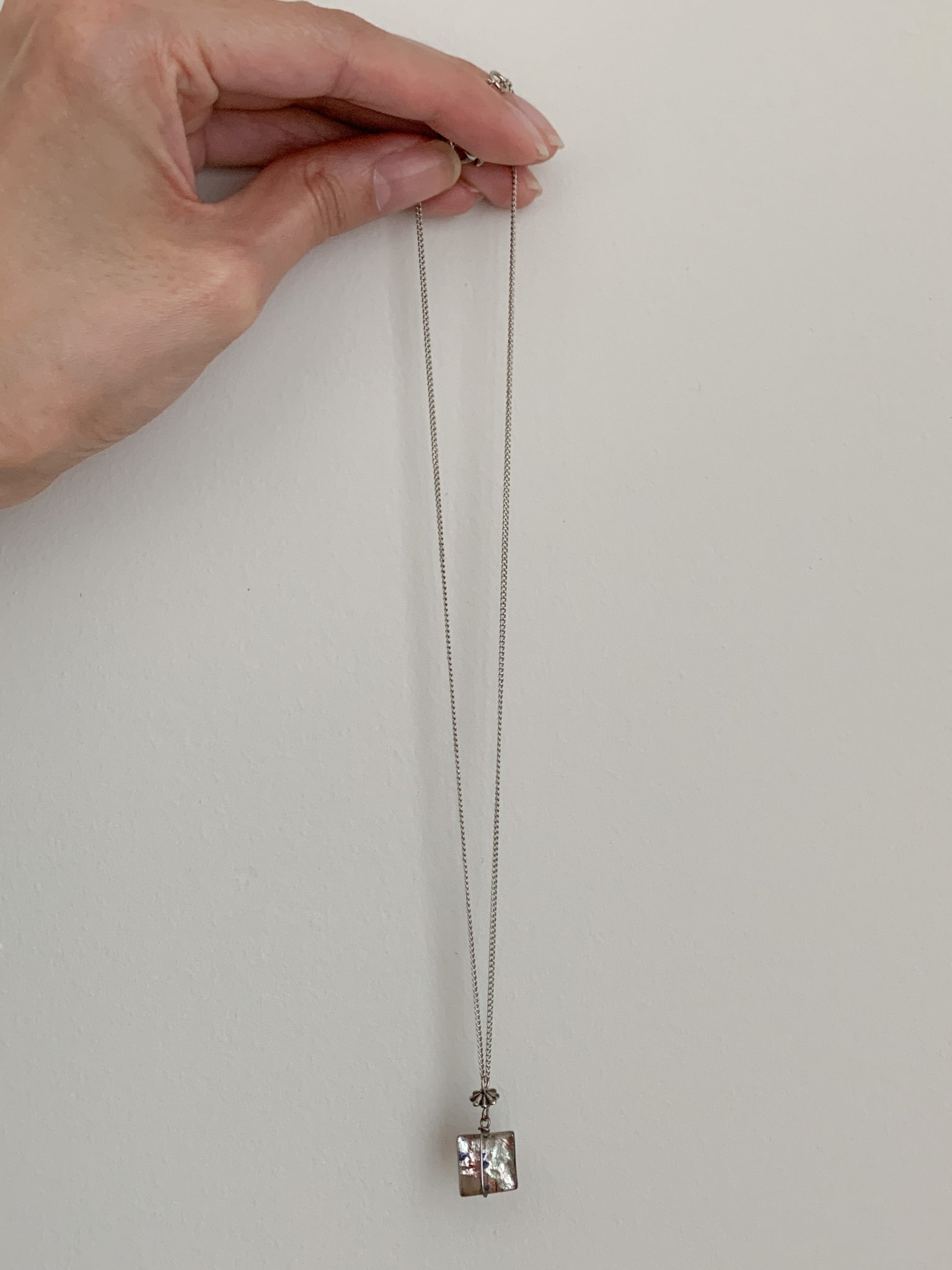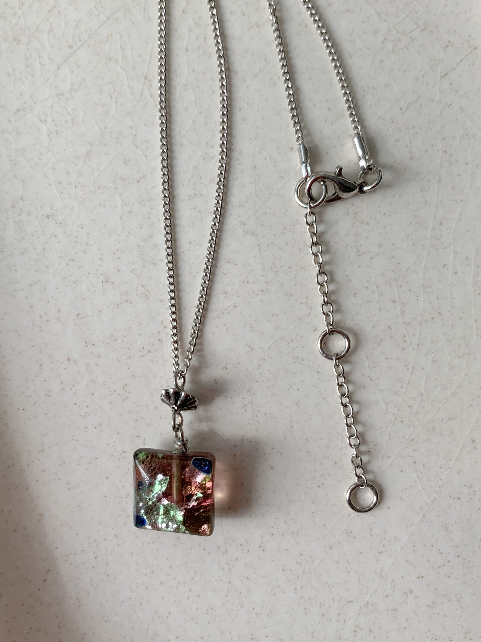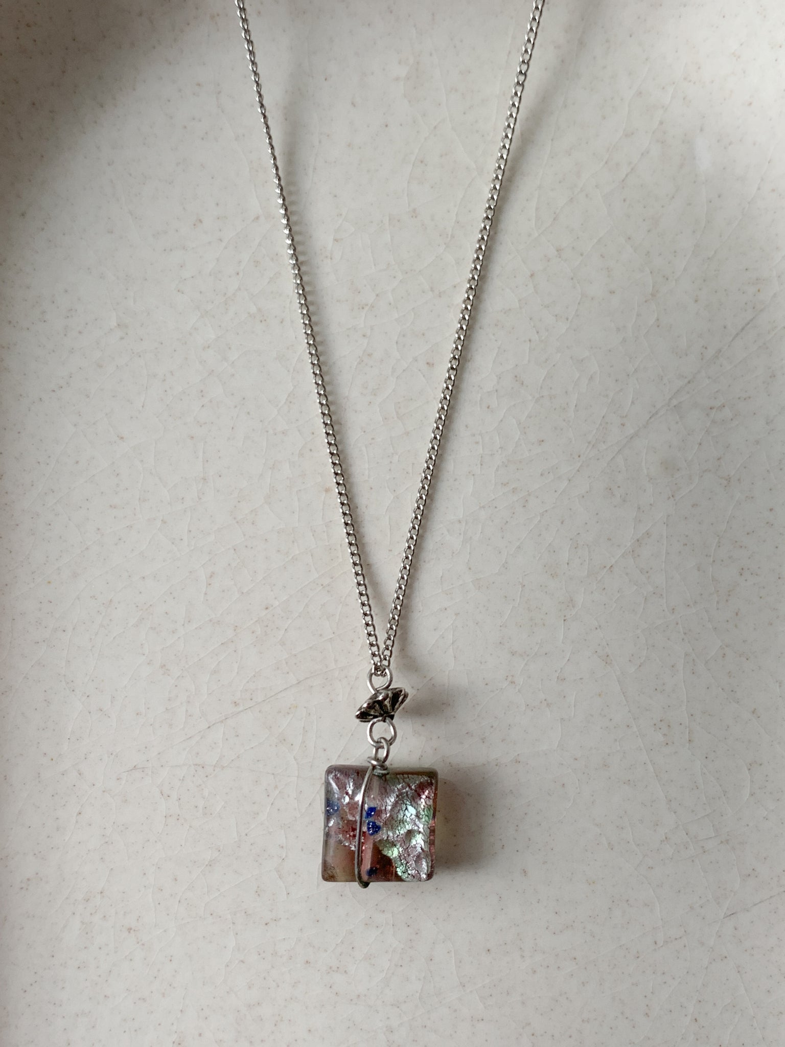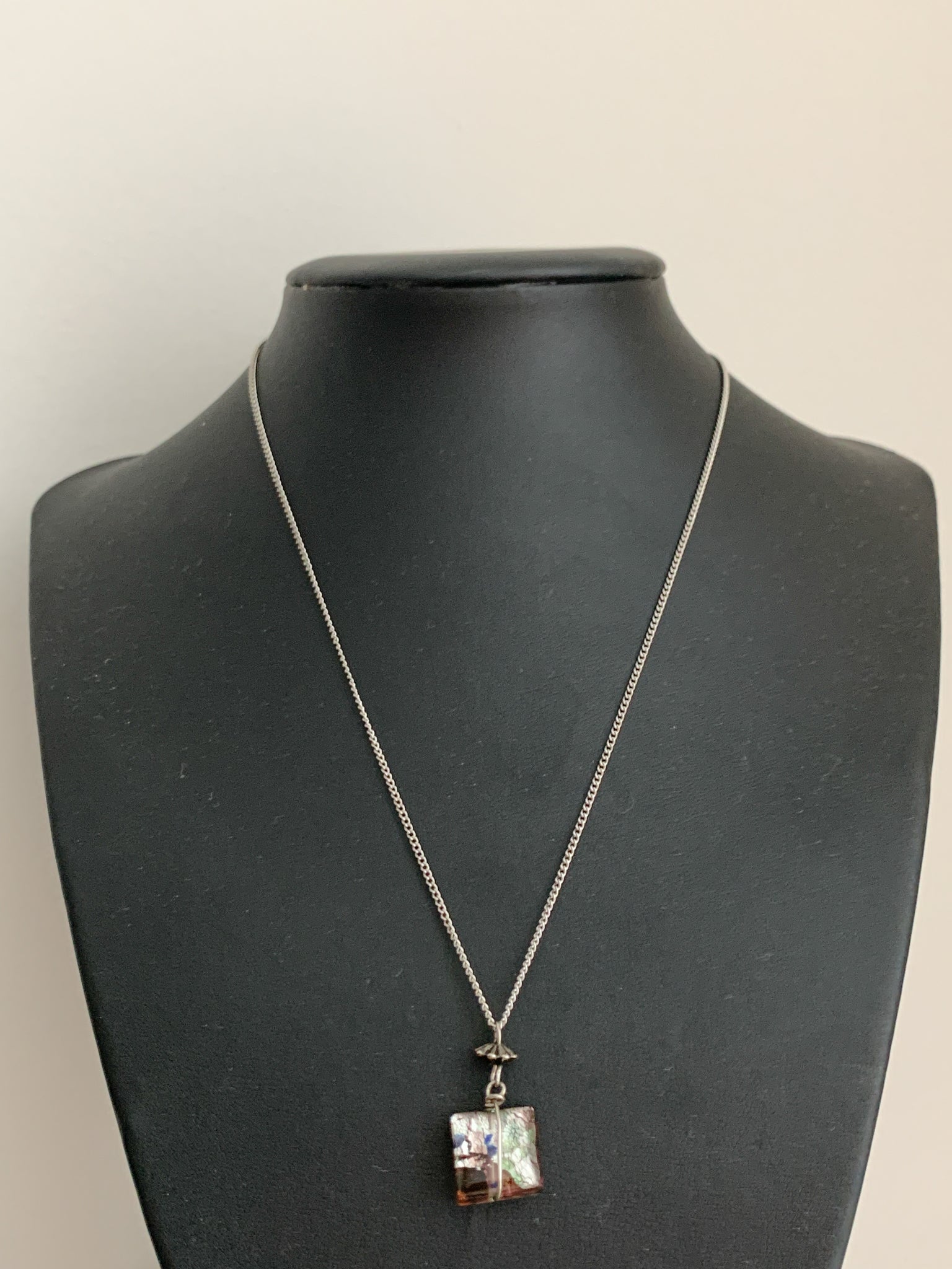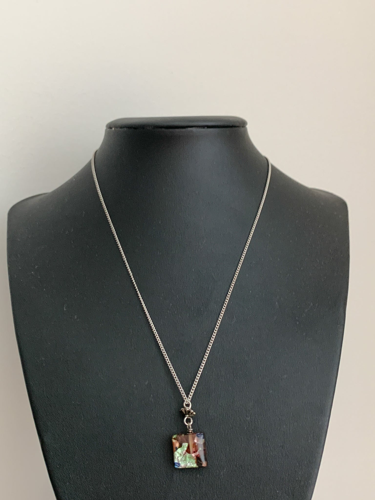 This pendant features a bead with an intricate multi-color scheme, such as that of a painter. It hangs along a silver tone chain.Â